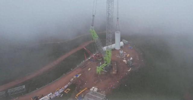 項(xiàng)目團(tuán)隊(duì)為了確保萬(wàn)無(wú)一失,在吊裝前反復(fù)推演。作為最后一臺(tái)風(fēng)機(jī)吊裝的主吊設(shè)備,最終通過(guò)中聯(lián)重科履帶式起重機(jī)的起升臂配合風(fēng)機(jī)葉片專用夾持工裝,將長(zhǎng)97.3m的葉片吊起并與相當(dāng)于33層樓高的輪轂完成精準(zhǔn)對(duì)接。