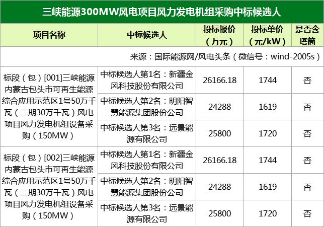 三峽能源內(nèi)蒙古包頭市可再生能源綜合應(yīng)用示范區(qū)1號(hào)50萬(wàn)千瓦(二期30萬(wàn)千瓦)風(fēng)電項(xiàng)目分為兩個(gè)標(biāo)段,標(biāo)段一和標(biāo)段二中標(biāo)候選人分別為金風(fēng)科技、明陽(yáng)智能、遠(yuǎn)景能源。