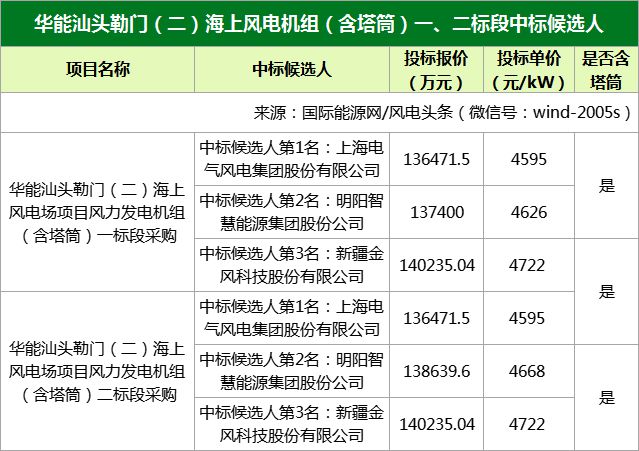 華能汕頭勒門(mén)(二)海上風(fēng)電場(chǎng)項(xiàng)目風(fēng)力發(fā)電機(jī)組(含塔筒)采購(gòu)一、二標(biāo)段中標(biāo)候選人分別為上海電氣、明陽(yáng)智能、金風(fēng)科技。