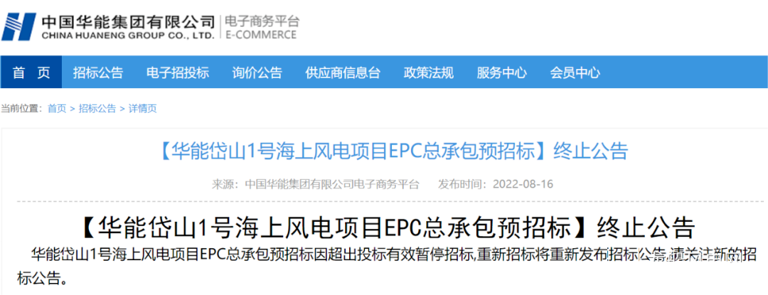 8月16日,華能集團(tuán)發(fā)布公告稱,因超出投標(biāo)有效期,決定終止華能岱山1號海上風(fēng)電項(xiàng)目EPC總承包預(yù)招標(biāo)項(xiàng)目。