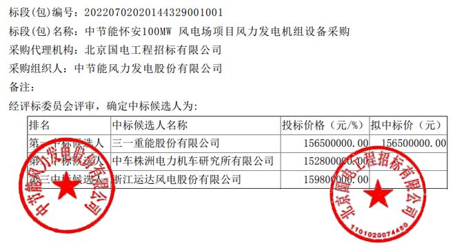 1月28日,中節(jié)能平臺發(fā)布《中節(jié)能懷安100MW風電場項目風力發(fā)電機組設備采購》中標候選人公示,三一重能預中標,投標報價15650萬元。