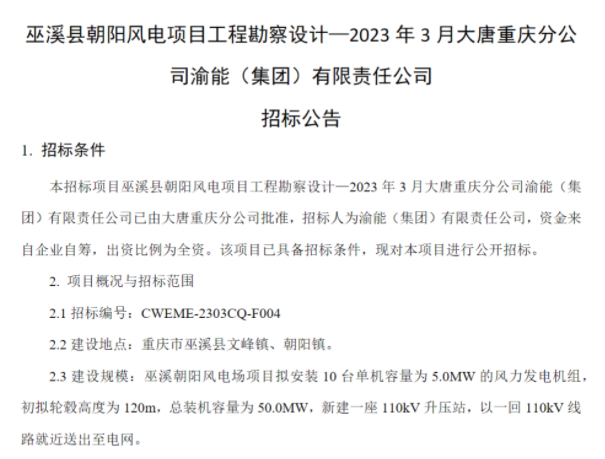 3月6日,大唐電子商務平臺發(fā)布《巫溪縣朝陽風電項目工程勘察設(shè)計-2023年3月大唐重慶分公司渝能(集團)有限責任公司招標公告》。