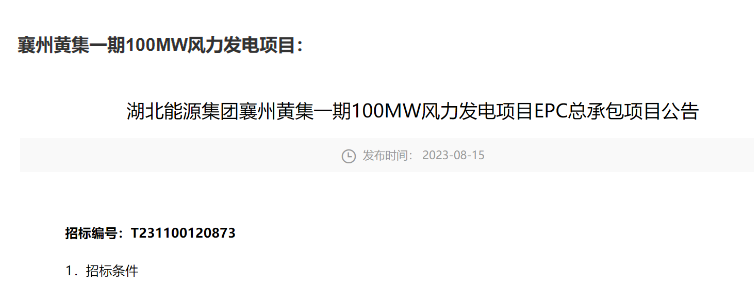 公告顯示,襄州黃集一期100MW風(fēng)力發(fā)電項(xiàng)目位于湖北省襄陽市襄州區(qū)黃集鎮(zhèn)境內(nèi),裝機(jī)規(guī)模100MW,安裝20臺單機(jī)容量為5000kW風(fēng)力發(fā)電機(jī)組,擬新建220kV升壓站一座。