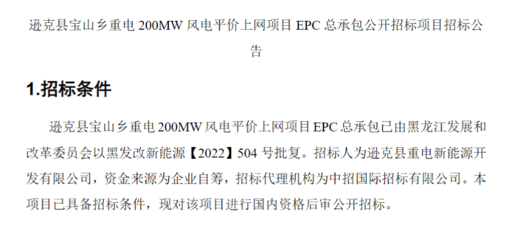 公告顯示,遜克縣寶山鄉(xiāng)重電200MW風(fēng)電平價(jià)上網(wǎng)項(xiàng)目位于黑龍江省黑河市遜克縣寶山鄉(xiāng)境內(nèi),場(chǎng)址中心距遜克縣城直線距離約50km,規(guī)劃裝機(jī)總?cè)萘繛?00MW,一次性建設(shè)完成,風(fēng)電場(chǎng)擬安裝32臺(tái)H193-6.25MW機(jī)型。