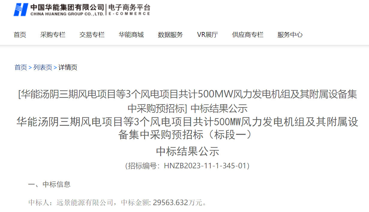 公告顯示,遠(yuǎn)景能源有限公司成功中標(biāo)該項目,中標(biāo)價格為29563.632萬元。