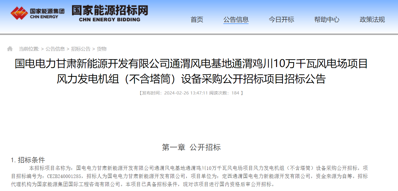 2月26日,國(guó)家能源招標(biāo)網(wǎng)發(fā)布《國(guó)電電力甘肅新能源開(kāi)發(fā)有限公司通渭風(fēng)電基地通渭雞川10萬(wàn)千瓦風(fēng)電場(chǎng)項(xiàng)目風(fēng)力發(fā)電機(jī)組(不含塔筒)設(shè)備采購(gòu)公開(kāi)招標(biāo)項(xiàng)目招標(biāo)公告》。