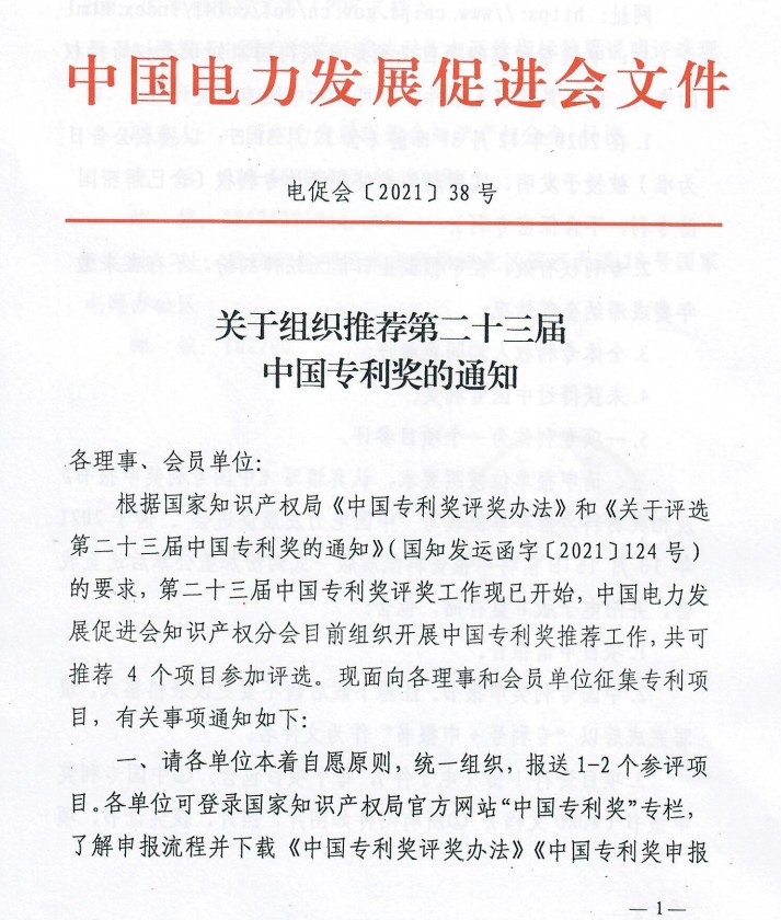 根據(jù)國(guó)家知識(shí)產(chǎn)權(quán)局《中國(guó)專(zhuān)利獎(jiǎng)評(píng)獎(jiǎng)辦法》和《關(guān)于評(píng)選第二十三屆中國(guó)專(zhuān)利獎(jiǎng)的通知》(國(guó)知發(fā)運(yùn)函字〔2021〕124號(hào))的要求,第二十三屆中國(guó)專(zhuān)利獎(jiǎng)評(píng)獎(jiǎng)工作現(xiàn)已開(kāi)始,中國(guó)電力發(fā)展促進(jìn)會(huì)知識(shí)產(chǎn)權(quán)分會(huì)目前組織開(kāi)展中國(guó)專(zhuān)利獎(jiǎng)推薦工作,共可推薦4個(gè)項(xiàng)目參加評(píng)選?,F(xiàn)面向各理事和會(huì)員單位征集專(zhuān)利項(xiàng)目,有關(guān)事項(xiàng)通知如下: