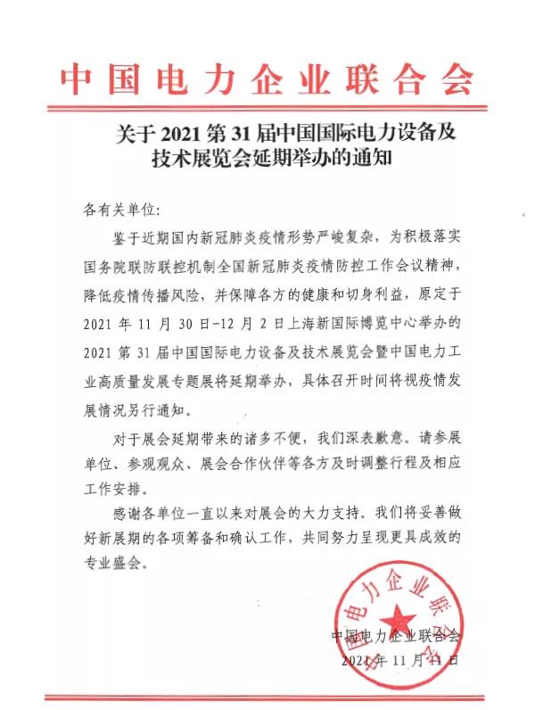 鑒于近期疫情防控形勢(shì)趨于嚴(yán)峻,為了貫徹落實(shí)國務(wù)院聯(lián)防聯(lián)控機(jī)制防疫要求,以所有參展商與觀眾的健康安全為首要考慮,同時(shí)保障展會(huì)效果,原定于 2021年11月30日至12月2日在上海新國際博覽中心舉辦的「第三十一屆上海國際電力設(shè)備及技術(shù)展覽會(huì)」暨「第二十三屆上海國際電工裝備展覽會(huì)」延期舉辦。具體延期方案將根據(jù)政府疫情防控規(guī)定另行通知。