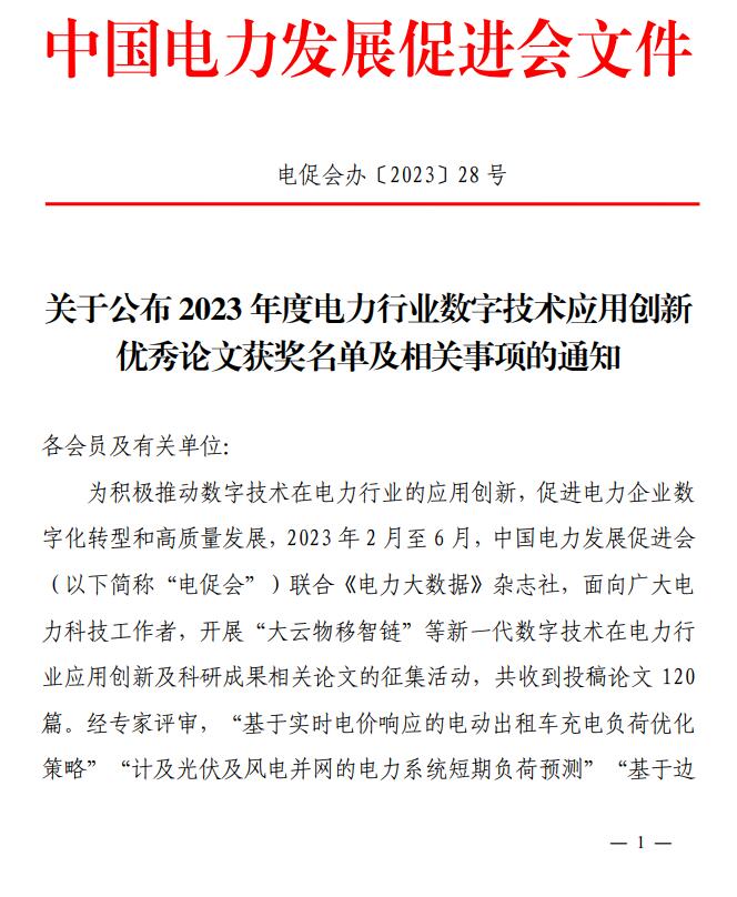 關(guān)于公布2023年度電力行業(yè)數(shù)字技術(shù)應(yīng)用創(chuàng)新優(yōu)秀論文獲獎(jiǎng)名單及相關(guān)事項(xiàng)的通知