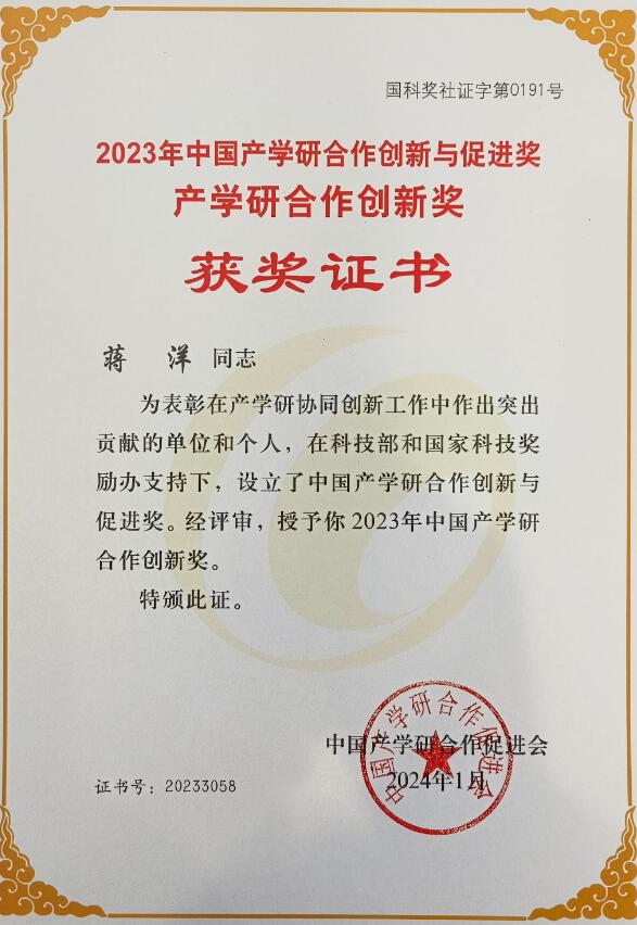 中國能建綠色建材公司黨委書記、董事長,綠色先進材料研究院院長蔣洋榮獲“2023年中國產(chǎn)學研合作創(chuàng)新獎”