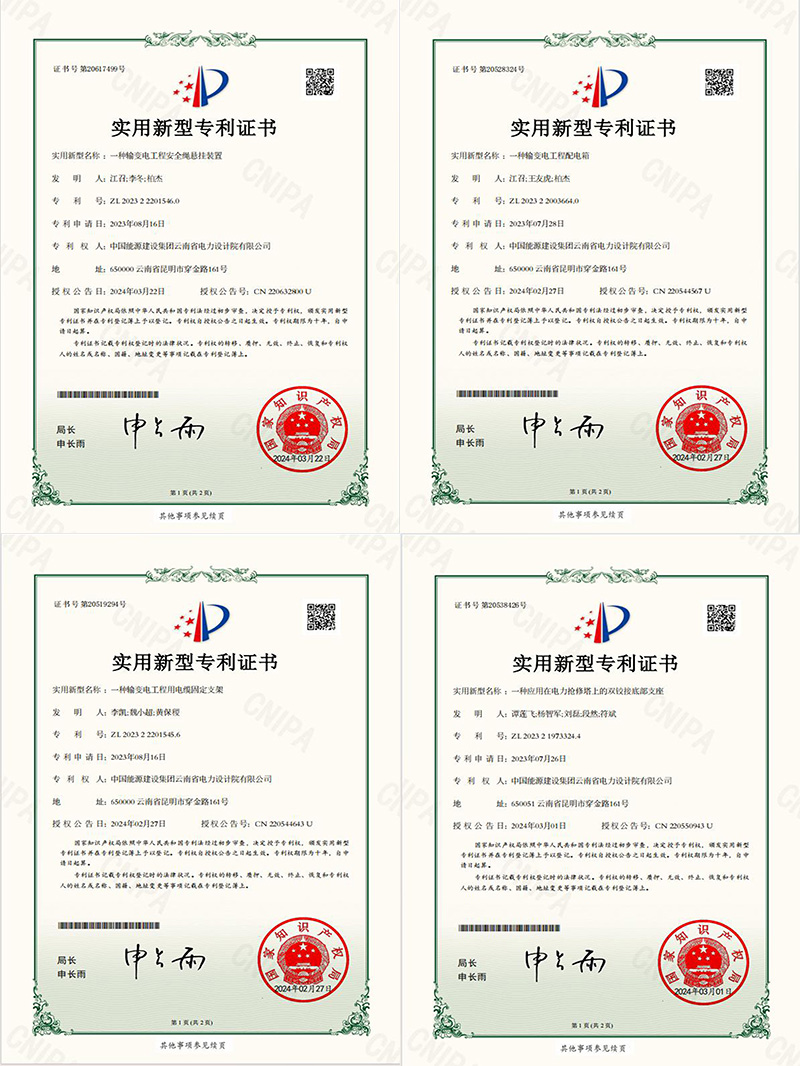 近日,由中國(guó)能建中電工程云南院獨(dú)立研發(fā)的“一種輸變電工程配電箱”“一種應(yīng)用在電力搶修塔上的雙鉸接底部支座”“一種輸變電工程用電纜固定支架”“一種輸變電工程安全繩懸掛裝置”四項(xiàng)成果獲得國(guó)家實(shí)用新型專利。