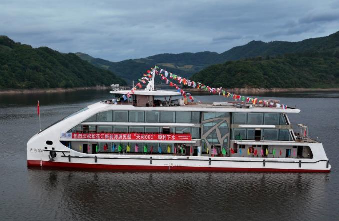 “天河一號”在東北地區(qū)創(chuàng)下多個(gè)第一,是噸位最大、載客最多、推進(jìn)功率最大、服務(wù)功能最全的內(nèi)河新能源游覽船,也是吉林省首艘混合動力綠色新能源船舶和首艘超500客位大型游覽船。“天河一號”在靖宇縣花園口鎮(zhèn)松江碼頭順利下水,標(biāo)志著松花江新能源游覽船“天河一號”建設(shè)項(xiàng)目邁入新的里程碑,為后續(xù)工作奠定了堅(jiān)實(shí)的基礎(chǔ)。
