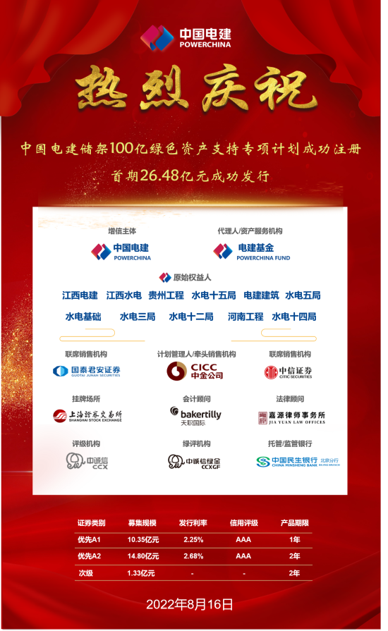 近日,“中國電建2022年第1-10期綠色資產(chǎn)支持專項計劃”取得上海證券交易所批復(fù),綠色儲架規(guī)模達100億元。本項目以電建股份成員單位持有的綠色應(yīng)收款項為基礎(chǔ)資產(chǎn),由電建股份作為增信機構(gòu),電建基金作為代理人統(tǒng)一歸集基礎(chǔ)資產(chǎn)并發(fā)行綠色資產(chǎn)支持證券。一次儲架分次發(fā)行和基金公司代理人模式為電建成員單位提供了壓降“兩金”、降低資產(chǎn)負(fù)債率的便捷高效新渠道。