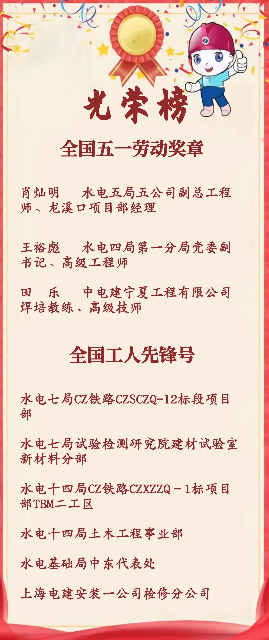 公司獲獎先進集體和個人,以高度的主人翁責任感、卓越的勞動創(chuàng)造、忘我的拼搏奉獻,在行業(yè)競爭中脫穎而出,在匠心營造中堅定前行,在市場拓展中乘風破浪,在逐夢海外中攻堅克難,在科技自強中勇攀高峰,用智慧和汗水在平凡的工作崗位上,創(chuàng)造了不平凡的業(yè)績,在推動公司轉型升級、高質(zhì)量發(fā)展進程中積累了寶貴的精神財富,引領了勞動光榮、知識崇高、人才寶貴、創(chuàng)造偉大的社會風尚,譜寫了“中國夢·勞動美”的嶄新篇章。