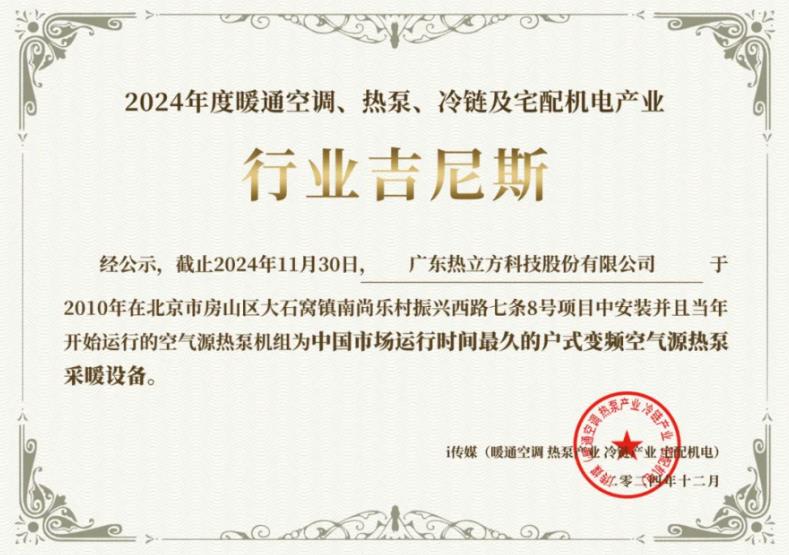 熱泵行業(yè)媒體i傳媒近日向熱立方地暖機頒發(fā)了一項榮譽——中國市場運行時間最久的戶式變頻空氣源熱泵采暖設備。據了解,該設備于2010年在北京市房山區(qū)大石窩鎮(zhèn)南尚樂村振興西路七條8號項目中安裝,并且當年開始運行,歷經15個供暖季后,依然穩(wěn)定運行無故障,創(chuàng)造了中國市場運行時長的行業(yè)紀錄。該項檢測由“建筑環(huán)能科技有限公司建筑環(huán)境與能源檢測院”完成檢測認證。