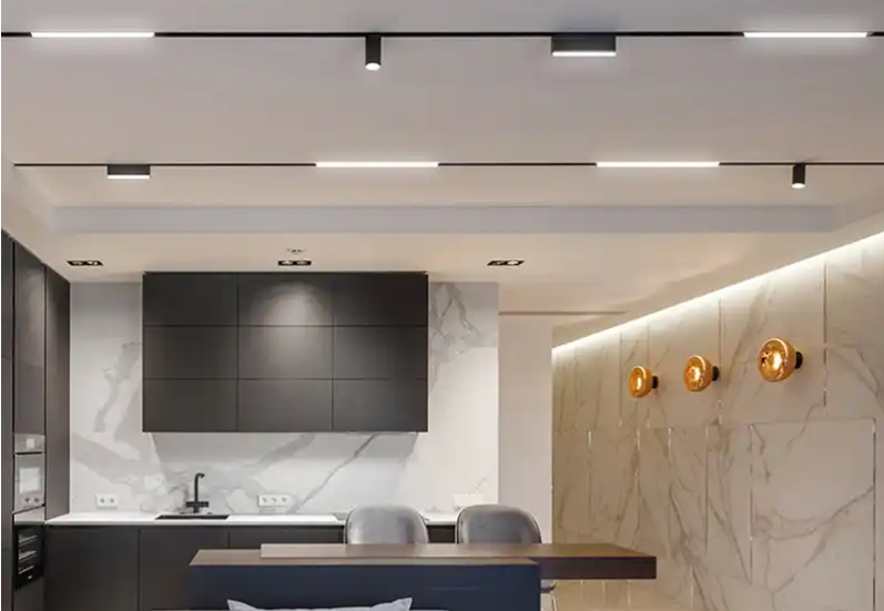 這次裝修時(shí)她選擇了更有氛圍感的無(wú)主燈設(shè)計(jì),雖然也沒(méi)有做吊頂,但是可以通過(guò)明裝筒燈、射燈、軌道燈、磁吸燈的組合設(shè)計(jì),打造一個(gè)有空間層次、有照明重點(diǎn)、有氛圍感的光環(huán)境,整個(gè)空間的高級(jí)感立馬就出來(lái)。