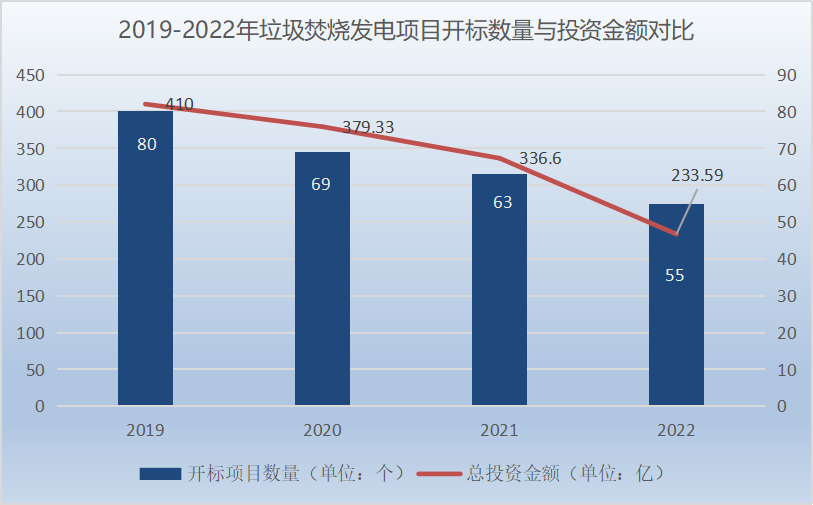 垃圾焚燒發(fā)電行業(yè)在歷經(jīng)“跑馬圈地”、“搶裝潮”等時(shí)期后,進(jìn)入冷靜發(fā)展期。北極星固廢網(wǎng)統(tǒng)計(jì)了2019年-2022年的垃圾焚燒發(fā)電項(xiàng)目開標(biāo)數(shù)量以及投資總額,整體呈逐年下滑趨勢。