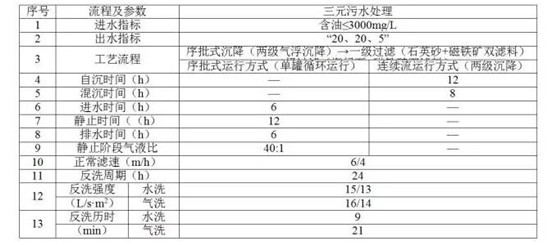 三采污水站分為普通聚驅(qū)污水站、高濃度聚驅(qū)污水站、三元污水站等,普通聚驅(qū)污水處理工藝流程與普通污水處理工藝流程相同,只是在過濾介質(zhì)、技術界限及工藝參數(shù)上做出調(diào)整。過濾介質(zhì)選擇適合含聚污水處理使用的石英砂、磁鐵礦等。當含聚污水中聚合物濃度高于450mg/L時,采用高濃度聚驅(qū)污水處理工藝,主要區(qū)別在于增加了沉降時間,過濾罐由石英砂改為石英砂磁鐵礦雙濾料過濾工藝。當處理含表活劑、聚合物、堿的三元污水時采用“連續(xù)流氣浮、序批曝氣沉降、石英砂磁鐵礦、海綠石磁鐵礦過濾”處理工藝三元污水處理工藝。