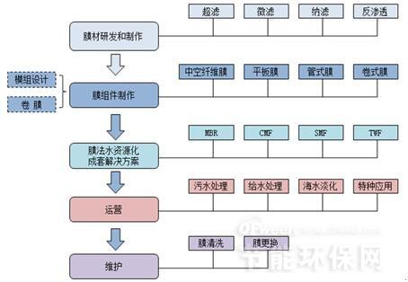 膜法水處理產業(yè)鏈由膜材料研發(fā)和制作、膜組件制作、膜法水資源化成套解決方案、運營和維護組成。其中膜法水資源化整體解決方案又涵蓋了工藝方案、投標、詳細設計、系統(tǒng)集成、施工安裝、系統(tǒng)試車、技術支持和售后服務等流程。其中,膜材料/膜元件制作和研發(fā)在整條產業(yè)鏈中擁有更高的技術先進性和盈利性。