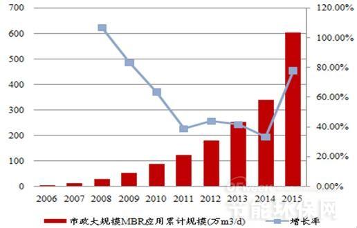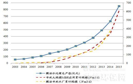 市政大規(guī)模MBR應用和膜法市政水廠規(guī)模變化與膜法水處理行業(yè)產值變化趨勢高度一致