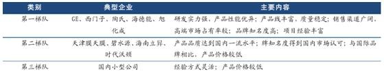 國內膜法水處理行業(yè)公司可劃分為國際領先企業(yè),國內領先企業(yè)和國內小型企業(yè)三個梯隊