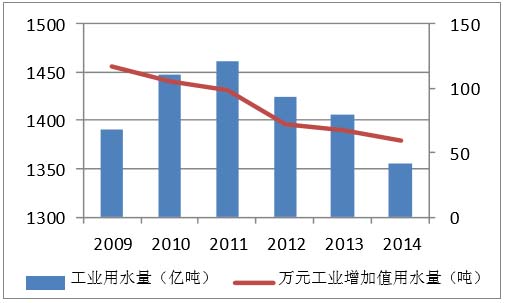 工業(yè)部門是用水大戶。2014年,工業(yè)總用水量1356.1億噸,、占全國年用水總量的22.2%。萬元工業(yè)增加值用水量從2007年的126噸下降至2014年的59.5噸。受用水量減少影響,工業(yè)廢水處理量和處理費用較2011年的峰值略有回落。2014年,共處理工業(yè)廢水500億噸。