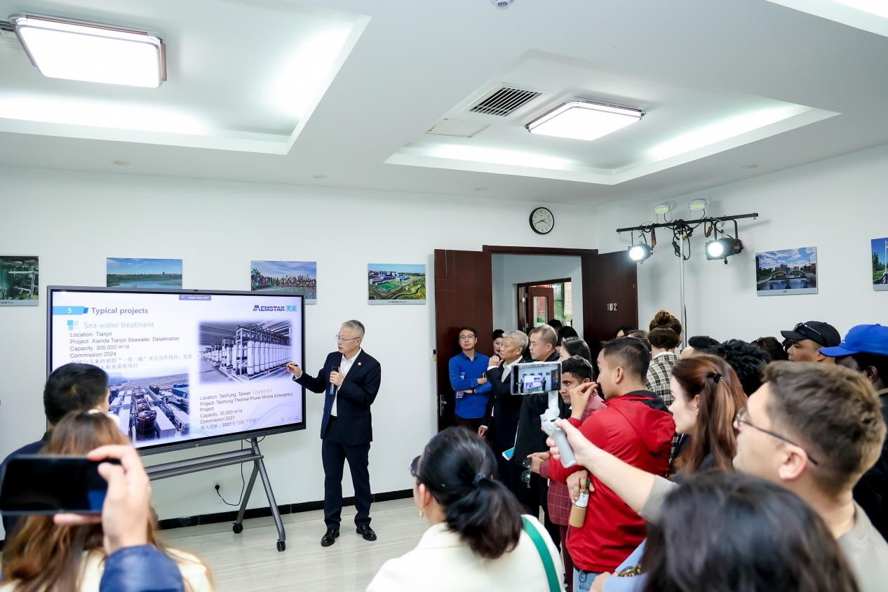 在近距離感受中信的水處理科技魅力后,在座談交流環(huán)節(jié),外媒對(duì)推動(dòng)全球環(huán)境治理的“中信方案”與“中信技術(shù)”興趣濃厚,圍繞如何平衡生態(tài)保護(hù)與經(jīng)濟(jì)發(fā)展、如何通過科技創(chuàng)新呵護(hù)綠色地球等話題,與中信環(huán)境展開熱烈而深入的交流。外媒團(tuán)記者將目光聚焦于中信環(huán)境的核心業(yè)務(wù)優(yōu)勢(shì)、美能膜技術(shù)亮點(diǎn)、海外市場(chǎng)布局、項(xiàng)目建設(shè)計(jì)劃等內(nèi)容,踴躍提問、積極發(fā)言。“中國(guó)茶與美能水給我們留下深刻印象,在水處理方面美能有何獨(dú)特技術(shù)優(yōu)勢(shì)?”“中信環(huán)境的生態(tài)技術(shù)和業(yè)務(wù)非常棒,未來是否有在中亞地區(qū)進(jìn)一步開拓市場(chǎng)的計(jì)劃?”“作為一家國(guó)際環(huán)保企業(yè),中信環(huán)境在不同地區(qū)有何不同市場(chǎng)策略?”“中信環(huán)境如何保證海外項(xiàng)目的可持續(xù)發(fā)展?”……熱盼合作的情緒在交流中不斷升溫,為座談會(huì)營(yíng)造了更加積極和富有建設(shè)性的氛圍。