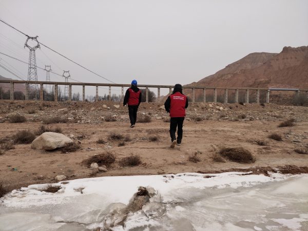 “不行咱們把鞋脫了蹚過去吧,繞著走太浪費時間了。”巡視人員楊玉來一邊向雙手哈著“熱氣”,一邊準備脫鞋。