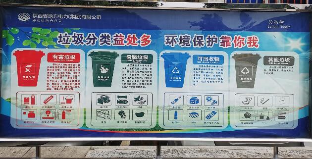 中國(guó)電力網(wǎng)訊(通訊員 李娟攝影報(bào)道)為倡導(dǎo)綠色生態(tài)、健康環(huán)保的生活方式,進(jìn)一步倡導(dǎo)垃圾分類理念,近日,淳化供電分公司更新公司文化宣傳欄,對(duì)有害垃圾、易腐垃圾、可回收垃圾、其他垃圾等通過圖文并茂的方式做了詳細(xì)說明,通過宣傳推廣,營(yíng)造人人關(guān)心垃圾分類、踐行垃圾分類的良好氛圍,讓"綠色、環(huán)保、低碳"的理念深入人心,從不而斷提高大家自覺愛護(hù)環(huán)境衛(wèi)生的意識(shí),讓垃圾分類從口號(hào)變?yōu)榱?xí)慣。