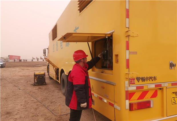開工儀式當(dāng)天沙塵天氣持續(xù),揚(yáng)沙隨風(fēng)彌漫,突擊隊(duì)的保電人員不辭辛苦一大早便提前進(jìn)入會場。將發(fā)電車??吭谇捌诓榭钡闹付ㄎ恢?,做好安全監(jiān)護(hù)相關(guān)的工作之后,啟動車輛試運(yùn)行,檢查了各項(xiàng)儀表數(shù)據(jù),并做好與用戶側(cè)供電設(shè)備的對接,全力以赴投入保電工作。該分局領(lǐng)導(dǎo)帶領(lǐng)保電人員全程守候在現(xiàn)場,隨時應(yīng)對突發(fā)停電事故的發(fā)生,確保了開工儀式用電萬無一失。
