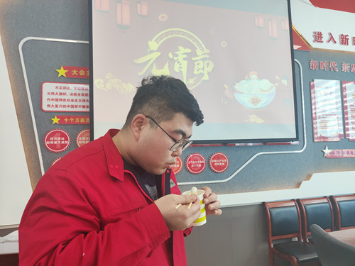 緊接著,趣味小游戲的開始又將整場活動掀起另一個高潮。為冬奧會吉祥物“冰墩敦”貼眼睛,展現了職工團隊協作能力;“扮時鐘”體現了職工對時間觀念的認知;最后的“聲聲報福”展現了職工的配合默契程度。歡聲笑語過后,大家每人一碗熱乎乎湯圓,寓意著“團團圓圓”,同時也祝愿全體職工在新的一年里能夠更加團結奮進,砥礪前行。