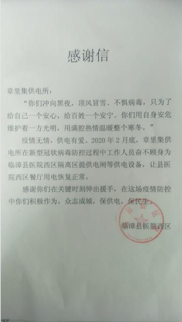 章里集供電所所長吳超接過重量雖輕卻又意義非凡的感謝信后激動地說:“謝謝你們對我們工作的肯定,疫情戰(zhàn)場上,是你們白衣天使沖鋒在前。作為國家電網(wǎng)人,我們更要發(fā)揚(yáng)頂?shù)蒙?、靠得住、打得贏得電力鐵軍精神,攜手打贏這場沒有硝煙的戰(zhàn)疫!”