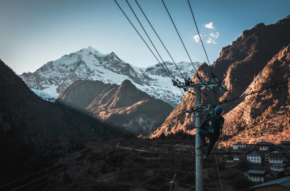 收到村民反映停電故障后,旺登一行立即開展檢查,發(fā)現(xiàn)故障出現(xiàn)在雨崩上村2號臺區(qū),且需要爬上12米高的電線桿進(jìn)行作業(yè)。只見旺登綁緊安全帶,戴上絕緣手套,踩實腳扣,并進(jìn)行簡短的沖擊試驗。隨后,他雙手扶住桿體,左腳穩(wěn)穩(wěn)地扣住,接著右腳向上提,一步一步交叉著往上。