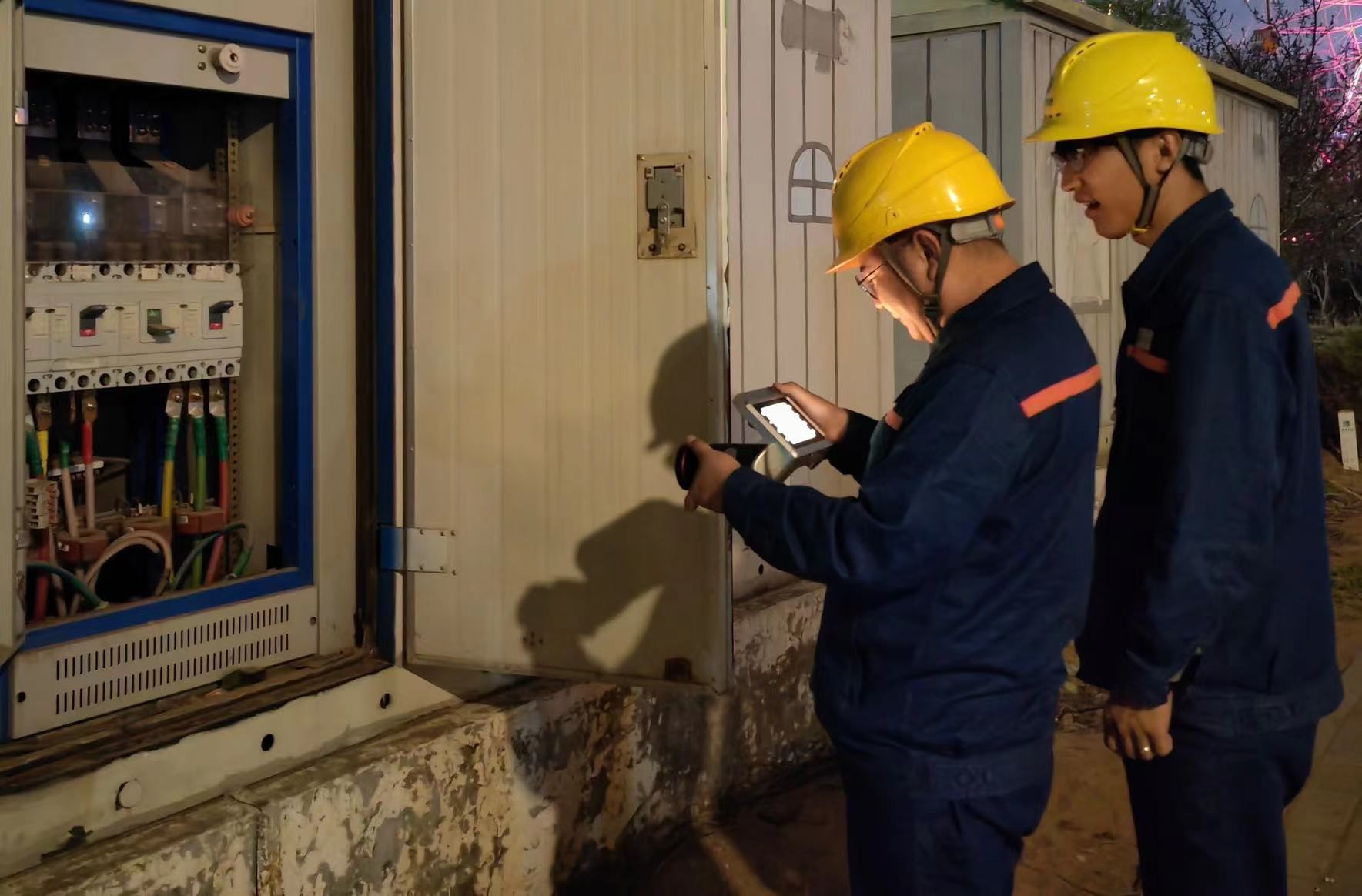 6月24日20時,熙熙攘攘的人群里,郭智遠和袁小龍穿行其中。今晚,他倆要完成蒙欣廣場和德榮2個夜市的用電安全檢查。“迎峰度夏期間工作量大,全憑兩條腿,必須要到現(xiàn)場實際檢查才能放心。”他們利用紅外測溫儀通過電暈、局部放電、溫升燒紅等現(xiàn)象來發(fā)現(xiàn)導線連接器及絕緣子存在的缺陷。對蒙欣廣場夜市、德榮夜市線路刀閘閘口、接頭、導線線夾等易發(fā)熱部位進行全方位檢查,及時掌握設備運行狀態(tài),避免設備出現(xiàn)故障。結束了夜市的用電安全檢查,收拾好工器具,已是22:20,但汗流浹背的兩個人并沒有回程,他們還要前往體育館的10千伏線路開展夜巡工作。