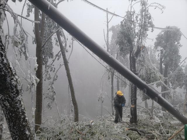為確保景區(qū)供電需求和游客安全,該公司組織30余名黨員干部職工兵分三路,一邊緊急調(diào)集大功率發(fā)電機(jī)抬運(yùn)至景區(qū),第一時間保障該線路用戶可靠供電,一邊協(xié)同云陽國家森林管理局、茶陵縣消防救援大隊(duì)緊急開展道路疏通搶險,一邊穿冰簾掃障礙,為搶修斷桿線路做準(zhǔn)備。到處是冰碴斷枝的山林里,不斷有晶瑩剔透的冰塊從樹上掉落,搶修人員一邊用柴刀對樹枝進(jìn)行清理,一邊爬冰臥雪艱難前行,清理道路,運(yùn)送桿線搶修物資,在零下冰凍的高山上,分秒必爭地投入到搶修中。