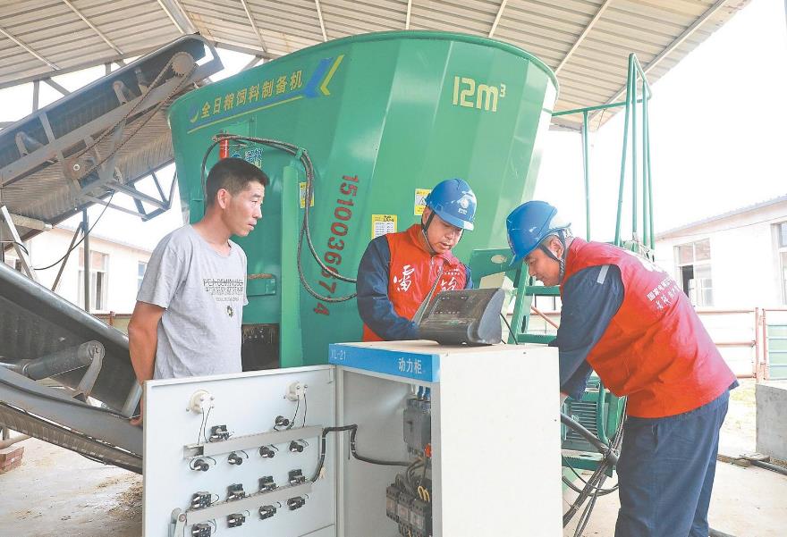 供電員工上門了解養(yǎng)殖戶用電需求,檢查飼料攪拌機(jī)運(yùn)行情況。