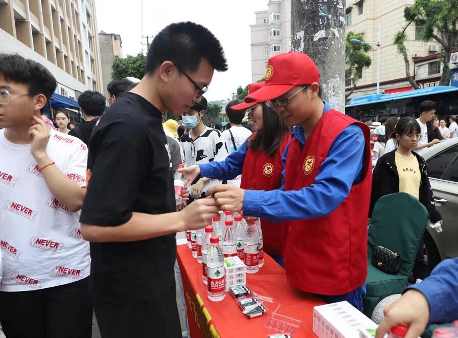 “保持平常心態(tài),加油,你們一定能考出好成績(jī)。”上午8時(shí)20分左右,隨著考生陸續(xù)進(jìn)場(chǎng),志愿服務(wù)點(diǎn)前熱鬧了起來(lái),志愿者一邊為有需要的考生派發(fā)考試和防暑用品,一邊為他們加油鼓勁。