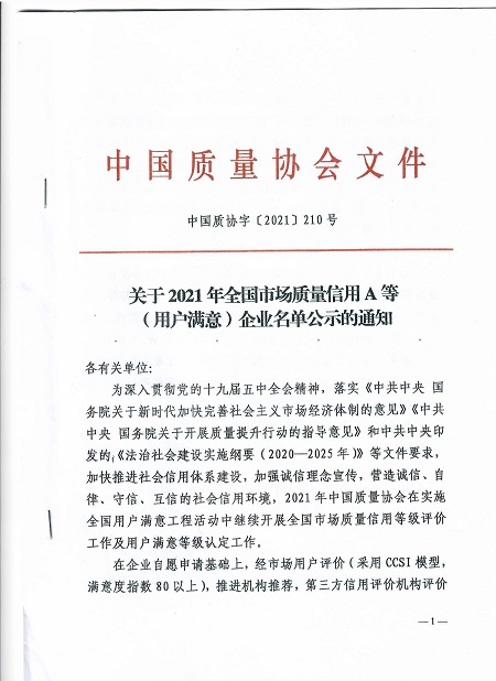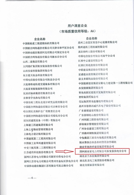 中國(guó)電力網(wǎng)訊 2021年11月18日,中國(guó)質(zhì)量協(xié)會(huì)發(fā)布了關(guān)于2021年全國(guó)市場(chǎng)質(zhì)量信用A等(用戶(hù)滿(mǎn)意)企業(yè)名單的通知(中國(guó)質(zhì)協(xié)字【2021】210號(hào)文)。經(jīng)過(guò)自愿申請(qǐng)、資料初審、第三方信用評(píng)價(jià)機(jī)構(gòu)評(píng)價(jià)和專(zhuān)家評(píng)審,國(guó)網(wǎng)湖南省東安縣供電分公司被評(píng)為用戶(hù)滿(mǎn)意企業(yè),市場(chǎng)質(zhì)量信用等級(jí)AA。