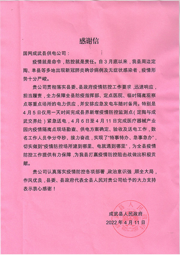 感謝信中說,自3月底以來,疫情形勢十分嚴峻,成武公司貫徹落實縣委、縣政府疫情防控工作要求,迅速響應(yīng)擔當履責。工作人員爭分奪秒、接力奮戰(zhàn),實現(xiàn)了“特事特辦、急事急辦”切實做到“疫情防控場所建到哪里、電就通到哪里",全力保障全縣防疫指揮部、定點醫(yī)院、臨時隔離觀察點等重點場所的電力供應(yīng),并安排應(yīng)急發(fā)電車隨時備用,體現(xiàn)了政治意識強,顧全大局的優(yōu)良作風。
