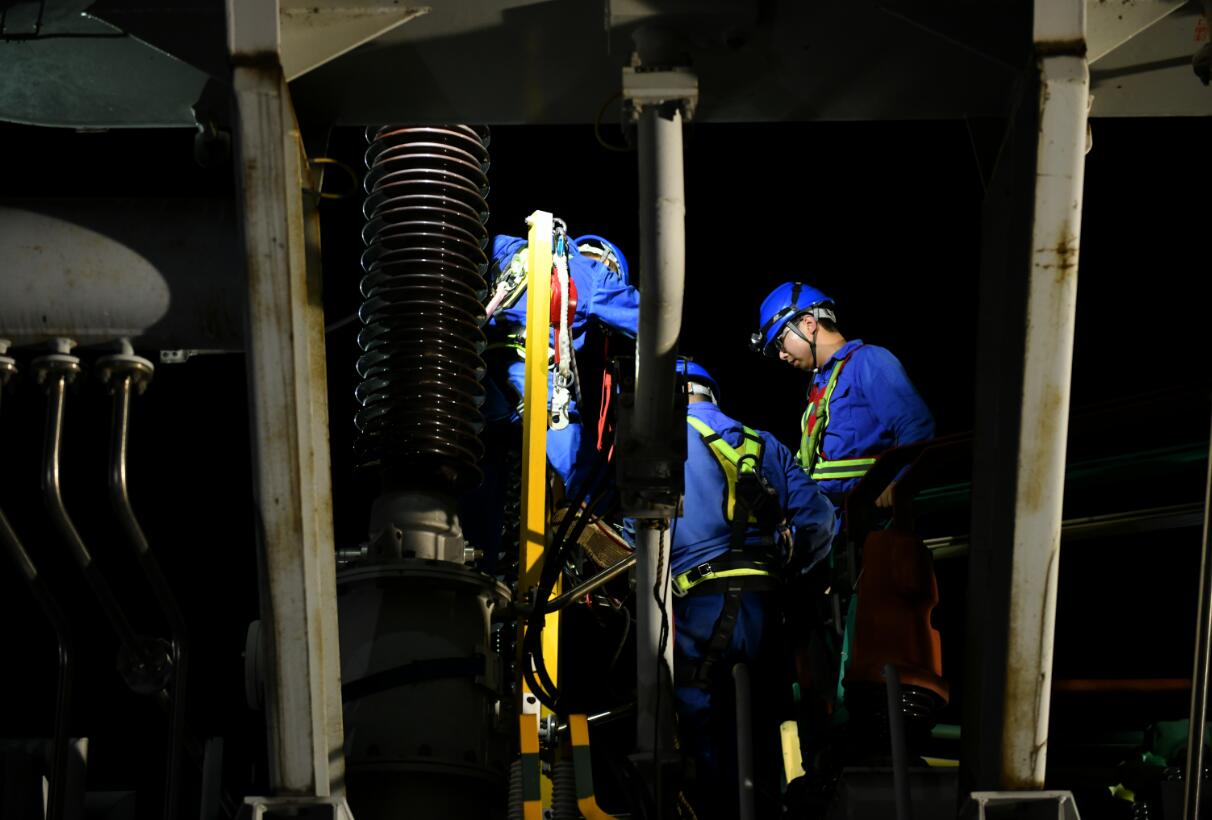 晚上19時(shí)23分,牟山變2號(hào)主變停役,消缺工作正式開始,變電運(yùn)維人員在做好停電、驗(yàn)電、掛設(shè)接地線和裝設(shè)安全圍欄等安全措施后,7名檢修人員爬上了主變,輪流開展搶修工作。當(dāng)天正值浙江入伏第一天,即使是晚上,仍有著30多度的高溫,悶熱的天氣和無(wú)處不在的蚊蟲給搶修工作帶來(lái)了不小的影響,不一會(huì)他們后背已經(jīng)悄然濕透,隨手一拍就是帶血的蚊子。
