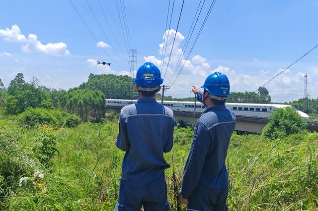 輸電運(yùn)維人員利用無人機(jī)對交叉跨越高速鐵路的線路開展巡視。賀州供電局供圖