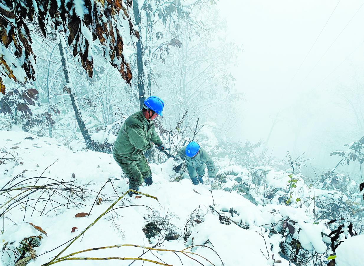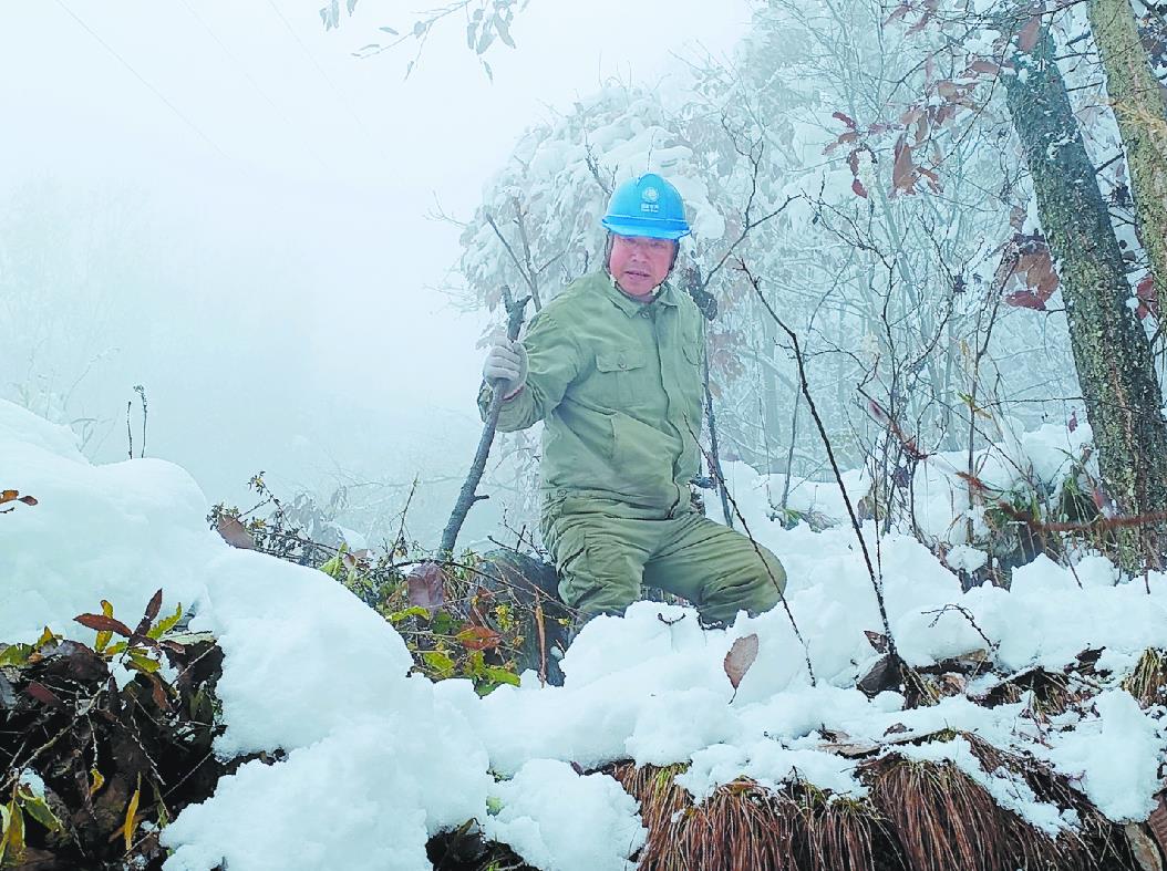 國(guó)網(wǎng)鄖西縣供電公司員工借助樹(shù)木拐杖巡視易覆冰區(qū)段線路。