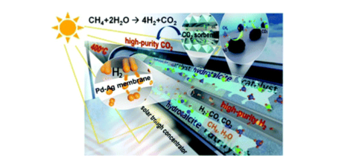 中國科學院工程熱物理研究所首次實現(xiàn)了400°C溫和條件下“凈零排放”的天然氣制氫原理突破。通過有序分離氫氣和二氧化碳產(chǎn)物,天然氣制氫反應溫度由傳統(tǒng)的800-1000°C降至400°C以下,實現(xiàn)了99%以上甲烷直接轉化為高純氫與高純二氧化碳,并實現(xiàn)了基于化石能源的制氫與脫碳的完全協(xié)同。制氫與脫碳能耗下降幅度達20-40%。基于此,該工作結合商業(yè)化中溫槽式聚光技術,實現(xiàn)了太陽能驅(qū)動的天然氣制氫與脫碳,進一步減少化石能源制氫的碳足跡,展示了化石能源與可再生能源互補實現(xiàn)可持續(xù)氫能利用的可行性。反應溫度的降低使工業(yè)余熱與氫能的結合成為可能。迄今為止,研究人員已完成了超過6000次的穩(wěn)定循環(huán)實驗,驗證了該方法的可靠性,并初步展示了技術轉化應用的廣闊前景。