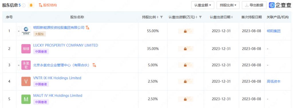 據(jù)企查查顯示,8 月 8 日,北京明陽氫能科技有限公司注冊成立,該公司注冊資本 2000 萬元,由風(fēng)電龍頭企業(yè)明陽集團(tuán)、祿順有限公司(LUCKY PROSPERITY COMPANY LIMITED)、北京永氫宏企業(yè)管理中心 ( 有限合伙 ) 等多家單位共同持股,其中明陽集團(tuán)持有 55% 股份、為最大股東,明陽集團(tuán)董事長張傳衛(wèi)擔(dān)任該公司法定代表人。