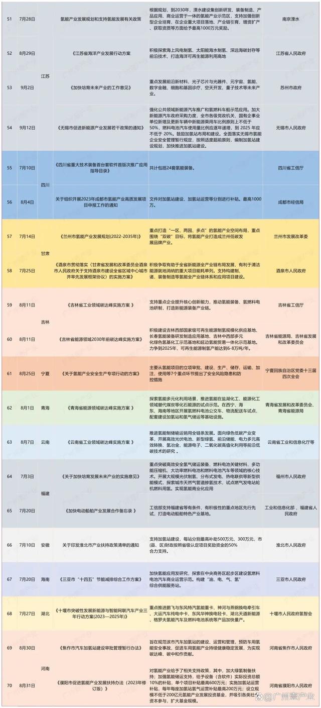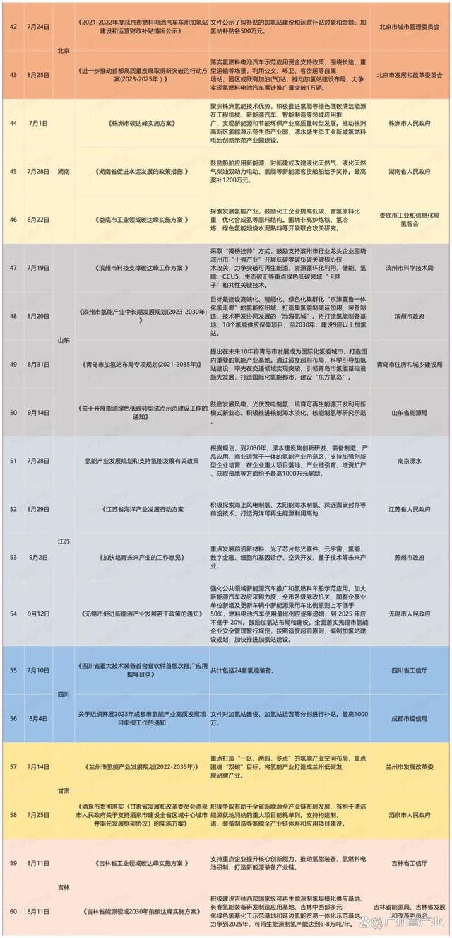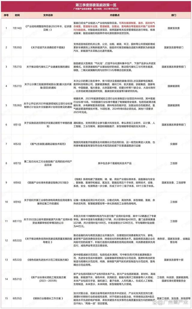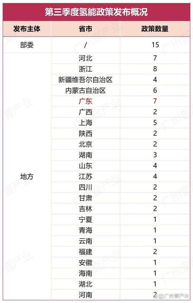 9月17日,浙江省嵊州市人民政府發(fā)布了《關(guān)于加快推進(jìn)新能源裝備產(chǎn)業(yè)高質(zhì)量發(fā)展的實(shí)施意見(征求意見稿)》。其中提到,積極布局發(fā)展氫能產(chǎn)業(yè)。布局發(fā)展氫能“制儲(chǔ)輸用”、氫燃料電池系統(tǒng)等氫能產(chǎn)業(yè)鏈。9月14日,山東省能源局發(fā)布了《關(guān)于開展能源綠色低碳轉(zhuǎn)型試點(diǎn)示范建設(shè)工作的通知》。文件中涉及到氫能的內(nèi)容有:鼓勵(lì)發(fā)展風(fēng)電、光伏發(fā)電制氫,培育可再生能源開發(fā)利用新模式新業(yè)態(tài);積極推進(jìn)核能海水淡化、核能制氫等研究示范等。9月13日,佛山市人民政府印發(fā)了《佛山市碳達(dá)峰實(shí)施方案》的通知。方案中提到,重點(diǎn)發(fā)展氫能產(chǎn)業(yè)。牽頭推進(jìn)廣東燃料電池汽車示范應(yīng)用城市群建設(shè),強(qiáng)化城市群內(nèi)各市資源共享、優(yōu)勢互補(bǔ)。加強(qiáng)氫能基礎(chǔ)設(shè)施建設(shè)。推動(dòng)氫能示范應(yīng)用擴(kuò)面,促進(jìn)氫能產(chǎn)業(yè)要素集聚,培育引進(jìn)優(yōu)勢骨干企業(yè),實(shí)現(xiàn)氫能產(chǎn)業(yè)強(qiáng)鏈補(bǔ)鏈,打造大灣區(qū)氫能產(chǎn)業(yè)高地。持續(xù)推動(dòng)南海區(qū)“仙湖氫谷”、一汽解放南方新能源汽車基地等園區(qū)載體建設(shè)。到2025年,培育氫能及燃料電池企業(yè)超過170家,到2030年,培育氫能及燃料電池企業(yè)超過200家。......據(jù)廣州壹產(chǎn)業(yè)不完全統(tǒng)計(jì),截至9月25日,今年第三季度(7、8、9月),部委共發(fā)布15條與氫能相關(guān)的政策,地方則有23個(gè)省(市)發(fā)布了70條氫能政策,合計(jì)85條。