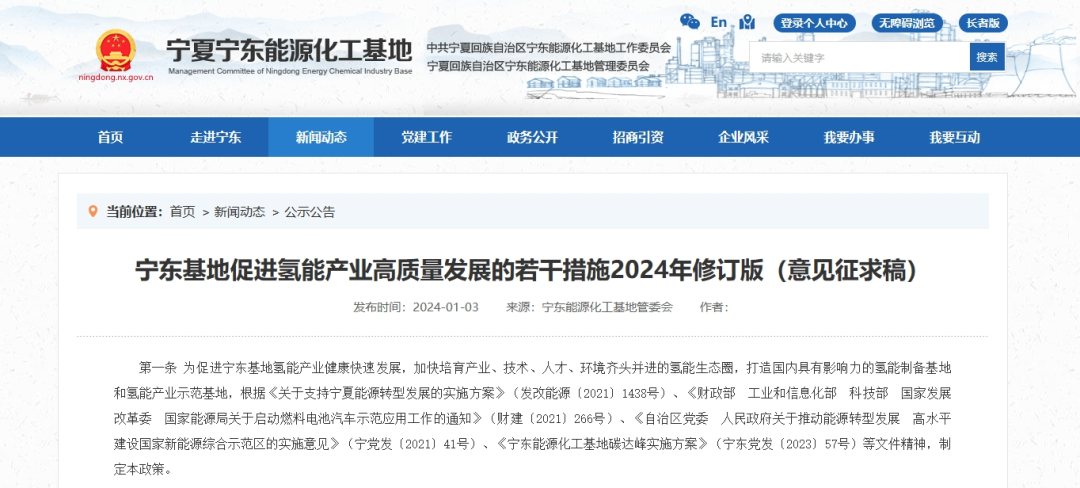 1月3日,寧東能源化工基地管委會發(fā)布寧東基地促進氫能產業(yè)高質量發(fā)展的若干措施2024年修訂版(送審稿),其中指出,鼓勵、支持企業(yè)向綠氫生產和應用方向轉型升級,在建設時序上,應確保制氫和應用端先開工,新能源部分不得早于制氫負荷及應用設施投產;制氫及應用分期投產的,配套新能源應按對應規(guī)模分期建設。