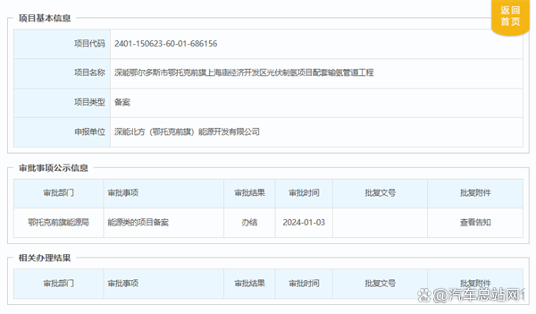 近日,深能鄂爾多斯市鄂托克前旗上海廟經(jīng)濟開發(fā)區(qū)光伏制氫項目配套輸氫管道工程獲批,鄂托克前旗能源局就該項目發(fā)布《項目備案告知書》。本項目屬于深能鄂爾多斯市鄂托克前旗上海廟經(jīng)濟開發(fā)區(qū)光伏制氫項目配套輸氫管道工程,新建一條DN150mm輸氫管線,供氣流量約5000標(biāo)方每小時,管線長度約2km,起于深能北方(鄂托克前旗)能源開發(fā)有限公司鄂爾多斯市鄂托克前旗上海廟經(jīng)濟開發(fā)區(qū)光伏制氫項目,止于潤陽悅達(dá)光伏裝備制造全產(chǎn)業(yè)鏈科技示范項目。