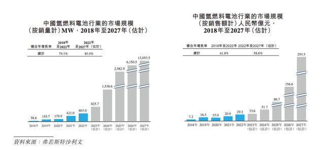 而中國氫燃料電池行業(yè)的市場規(guī)模也已由2018年的人民幣7億元增至2022年的29億元,復(fù)合年增長率為41.8%。預(yù)計將于2027年達到人民幣293億元。
