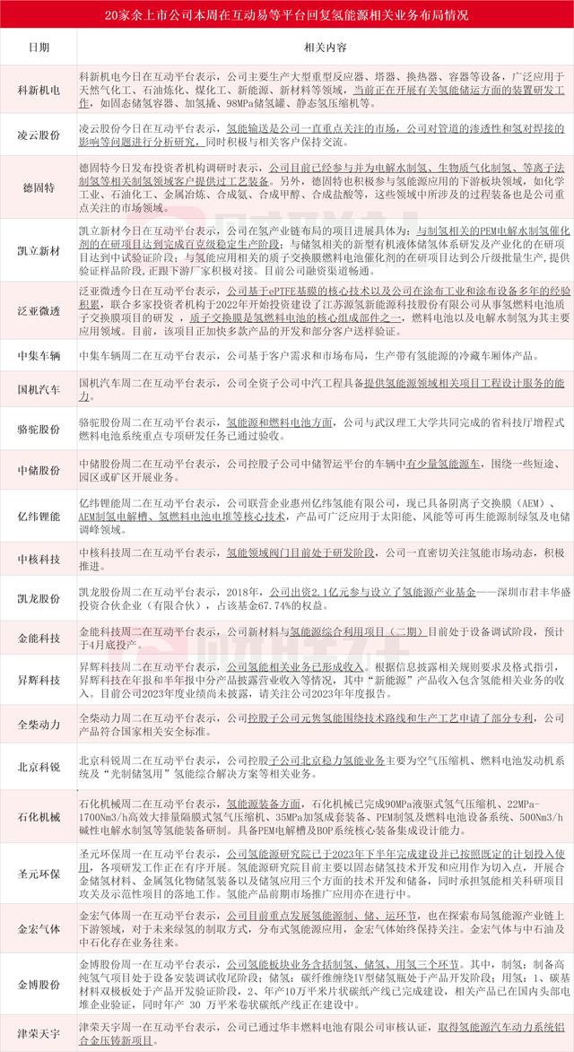 據(jù)財聯(lián)社不完全統(tǒng)計,科新機電、凌云股份、德固特、凱立新材、泛亞微透、中集車輛、國機汽車、駱駝股份、中儲股份、億緯鋰能、中核科技、凱龍股份、金能科技、昇輝科技、全柴動力、北京科銳、石化機械、圣元環(huán)保、金宏氣體、金博股份和津榮天宇在內(nèi)的21家上市公司本周在互動易等平臺回復(fù)氫能源相關(guān)業(yè)務(wù)情況。其中,德固特今日發(fā)布投資者機構(gòu)調(diào)研時表示,公司目前已經(jīng)參與并為制氫領(lǐng)域客戶提供過工藝裝備。凱立新材今日在互動平臺表示,公司在氫產(chǎn)業(yè)鏈布局的項目進(jìn)展具體為:與制氫相關(guān)的PEM電解水制氫催化劑的在研項目達(dá)到完成百克級穩(wěn)定生產(chǎn)階段。具體情況如下圖: