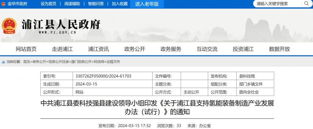 關(guān)于浦江縣支持氫能裝備制造產(chǎn)業(yè)發(fā)展辦法(試行)